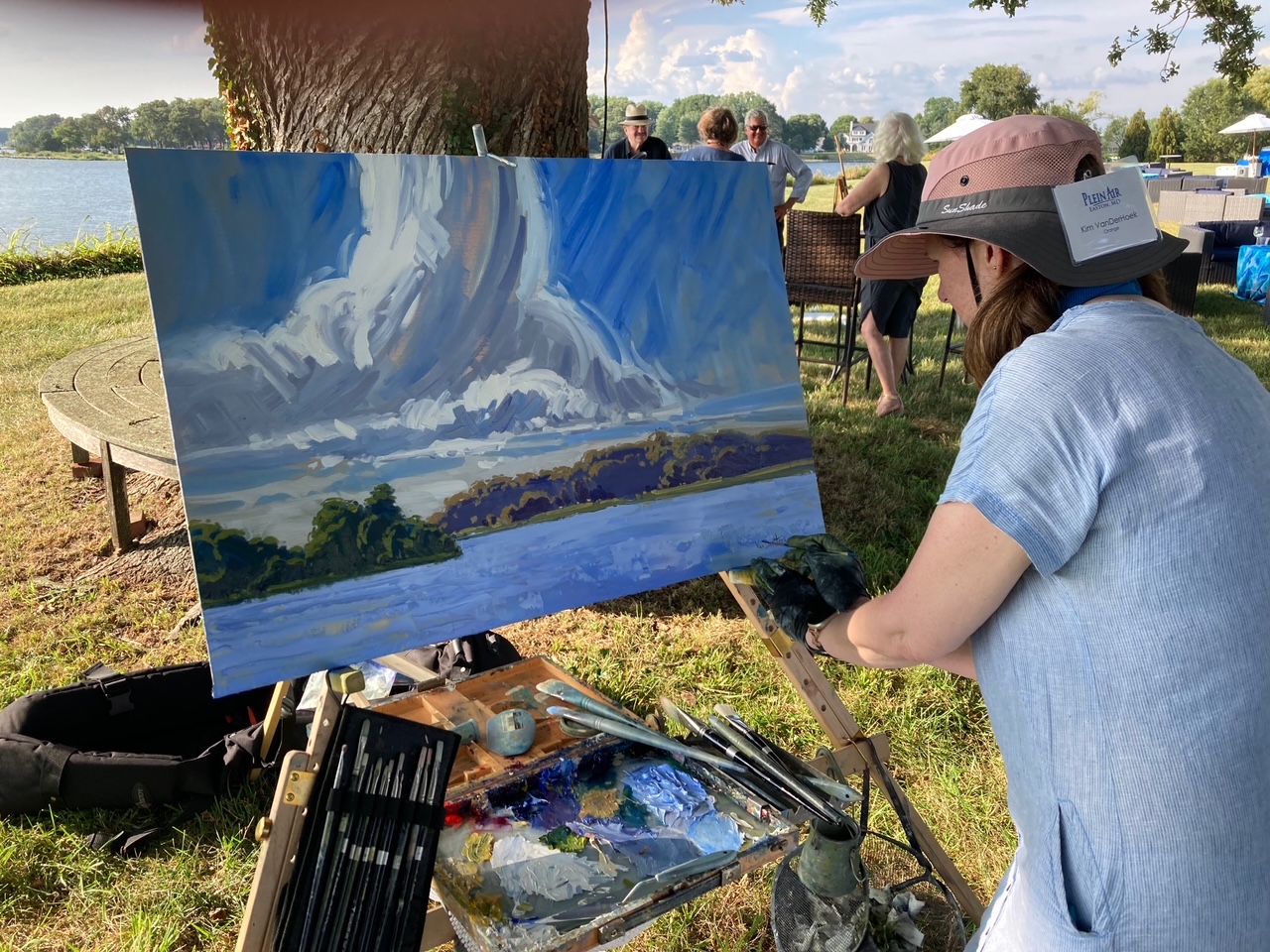 Kim VanDerHoek, who flew in for her eighth PAE from Orange, California, painted along the shoreline confluence of the Wye River with Gross and Lloyd creeks framing a view of Wye Island and, in the distance from Gross Coate Farm, Bennett’s Point in Queen Anne’s County. She joked about the clouds over the scene she was committing to her 24-by-36-inch canvas. “They don’t pose for you,” she said, adding that she chose her spot beneath a sprawling tree for the shade and a breeze off the water as relief from the smothering afternoon humidity.