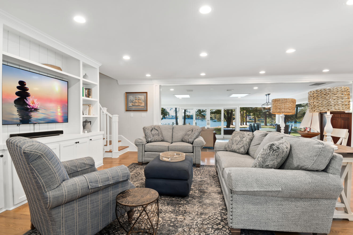 Opposite the rear wall of the library is a wet bar-so it would be very easy to linger in the library and get lost in a book! The vista from the library door to the wet bar ends at this kinetic artwork of waves crashing over rocks is a great “window” for this space and complements the color of the room’s walls.
