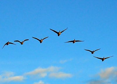 As each goose flaps its wings, it creates an “uplift” for the birds that follow. By flying in a “V” formation, the whole flock adds 71% greater flying range than if each bird flew alone.
