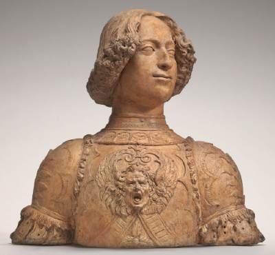 The terracotta portrait (1475-78) (24”x26”x11”) of Lorenzo’s younger brother Guiliano de Medici is by Andrea del Verrocchio (c.1435-1488). He was a sculptor, painter, and goldsmith, the teacher of Leonardo da Vinci, and a Medici favorite. The portrait was commissioned for Giuliano’s coming of age celebration when a joust took place in his honor. Guiliano was the handsome, athletic, and popular brother and was depicted in several works of art. His Roman style armor is decorated with a winged face. The bust may have been originally painted and worn a metal helmet. Guiliano and Lorenzo were co-rulers of Florence. Guiliano was assassinated in the Pazzi conspiracy to take over Florence on Sunday, April 28, 1478.