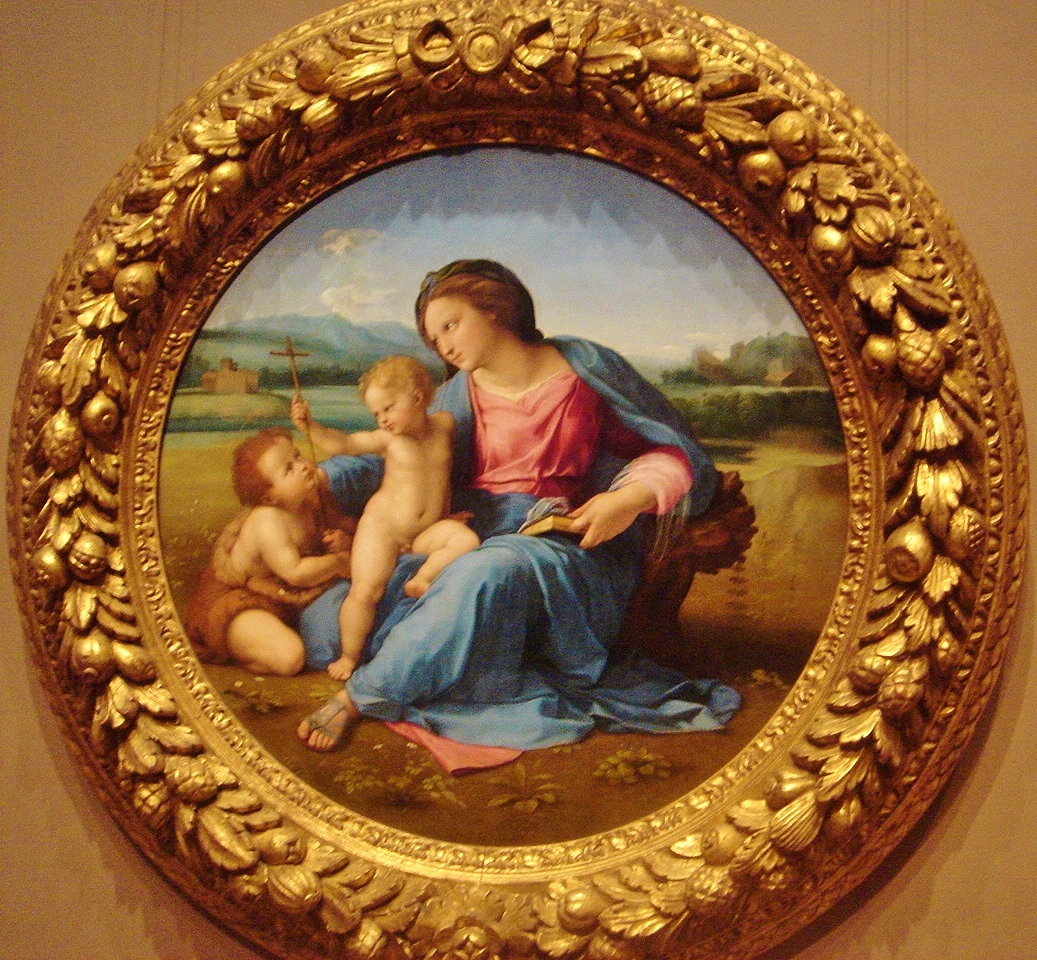 “Alba Madonna” (1510) (tondo 37’’) (oil) was painted by Raphael Sanzio (1483-1520) of Urbino, Italy. Of the three famous masters of the High Renaissance, Raphael was the youngest. Perugino was his teacher in Umbria from 1480 to 1500. He arrived in Florence in 1504 with a letter of recommendation: “The bearer of this will be found to be Raphael, painter of Urbino, who, being greatly gifted in his profession, has determined to spend some time in Florence to study. And because his father was most worthy and I was very attached to him, and the son is a sensible and well-mannered young man, on both accounts, I bare him great love.’’ Raphael was 21 years old, Michelangelo was 30, and da Vinci was 42. All were actively working in Florence. Raphael, an astute observer and eager to improve his craft, learned the best lessons these older artists’ work had to offer. He became a favorite of wealthy collectors.