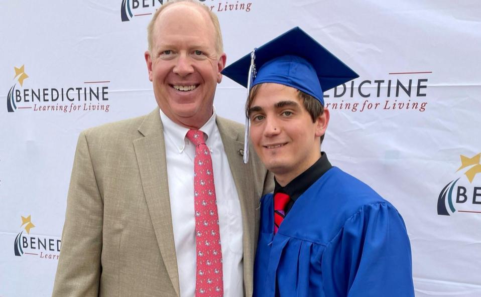 Scott Evans, Benedictine Executive Director, poses with graduate Ben who received the 2023 Student of the Year Award.