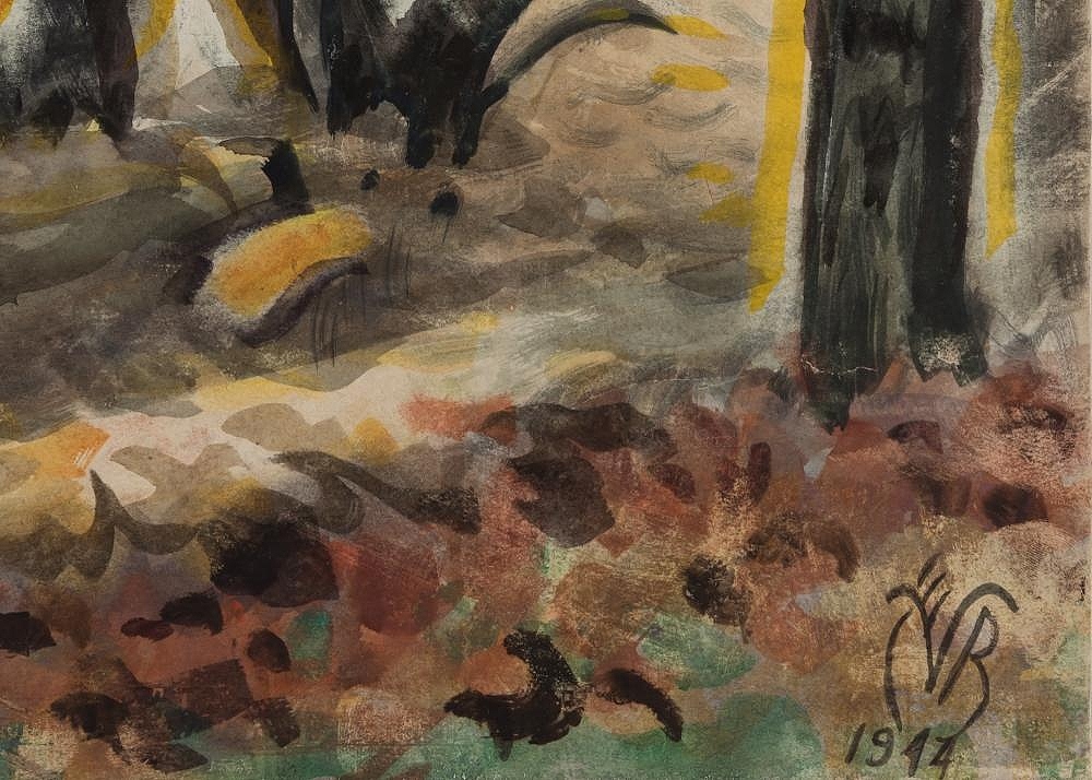 Burchfield graduated from the Cleveland Institute of Art in 1916, and he received a scholarship to attend the prestigious National Academy of Design in New York City. After just one day in a life drawing class, he left. In his early work, he had developed his own watercolor technique using washes, black ink for opaque areas, and white gouache, not acceptable in traditional watercolor. He used dry-brush watercolor on paper that stoop upright like a canvas on an easel. His unique technique would continue, but his subject matter broadened to include architecture. Burchfield served in the army, applying his painting skills to camouflage tanks and artificial hills. He was honorably discharged in 1919.