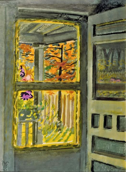 Burchfield painted “October Outside” (1963) (39”x27’’) indoors. He continued to paint no matter his health. The viewer sees a well-weathered wood door with several decorative panels and a glass window. The outdoor scene is reflected in the window. The pickets of the fence cast green shadows across the lawn. A green pot is set on a plant stand. The black tree trunk is topped with orange, red, and yellow leaves. Burchfield suffered a fatal heart attack in 1967. He was in the yard of his home, working on a painting to be titled “Early Spring.”