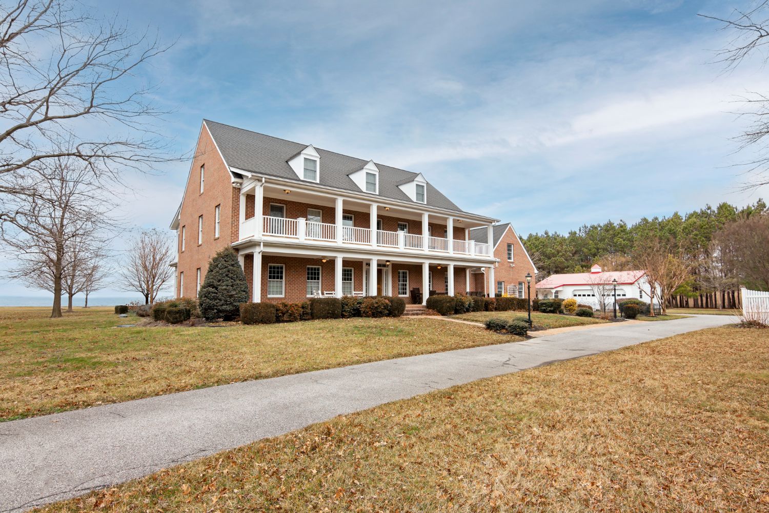 The two and a half story brick house’s traditional style with Georgian symmetry is articulated with open porches that span across both levels of the house that are painted white as an accent and three dormers at the attic level. The massing steps down to a one-story connection between the house and a front gable wing that contains a three-car garage. The connection contains a secondary entrance, laundry, utility room and tool storage. Past the house, a detached three-bay outbuilding contains more garage space and a finished storage room with its own entrance.