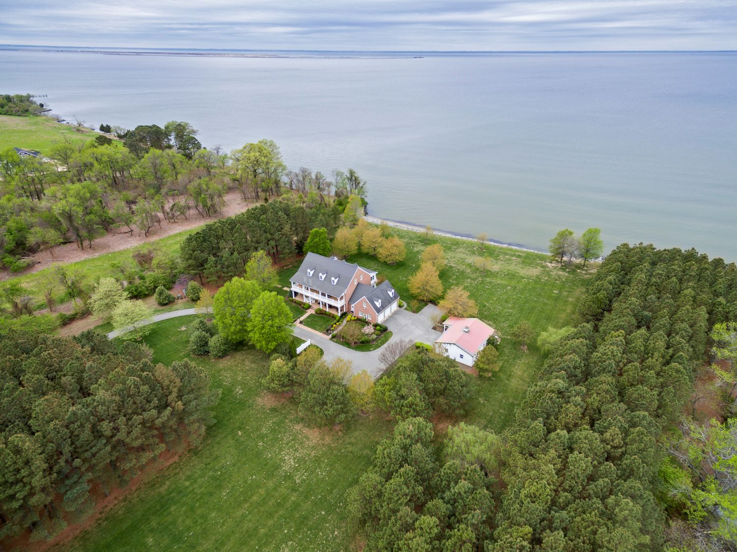Sweeping views of the property showcase the expansive 21.7-acre site and 624 feet of pristine Chesapeake Bay shoreline.