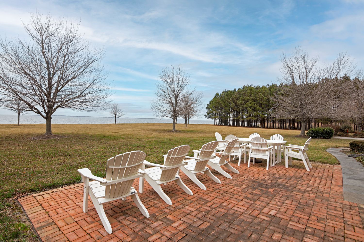 The patterned brick terrace blends seamlessly into the landscape, offering the perfect spot to enjoy unobstructed water views.