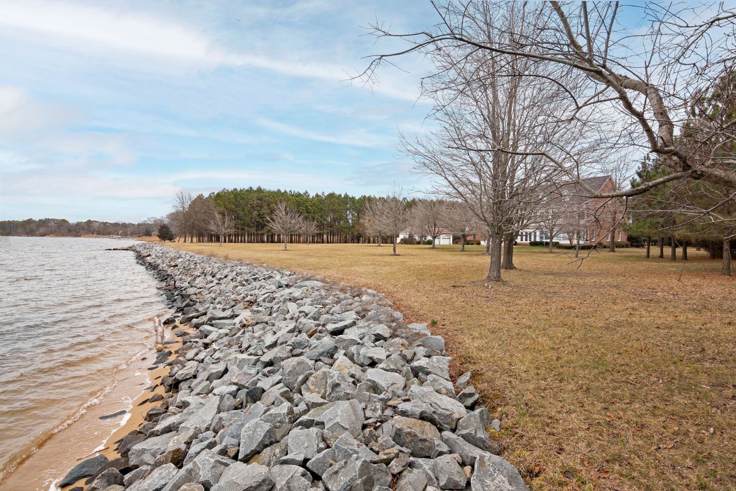 The riprapped shoreline creates a robust connection to nature, framed by dense woods that ensure privacy.