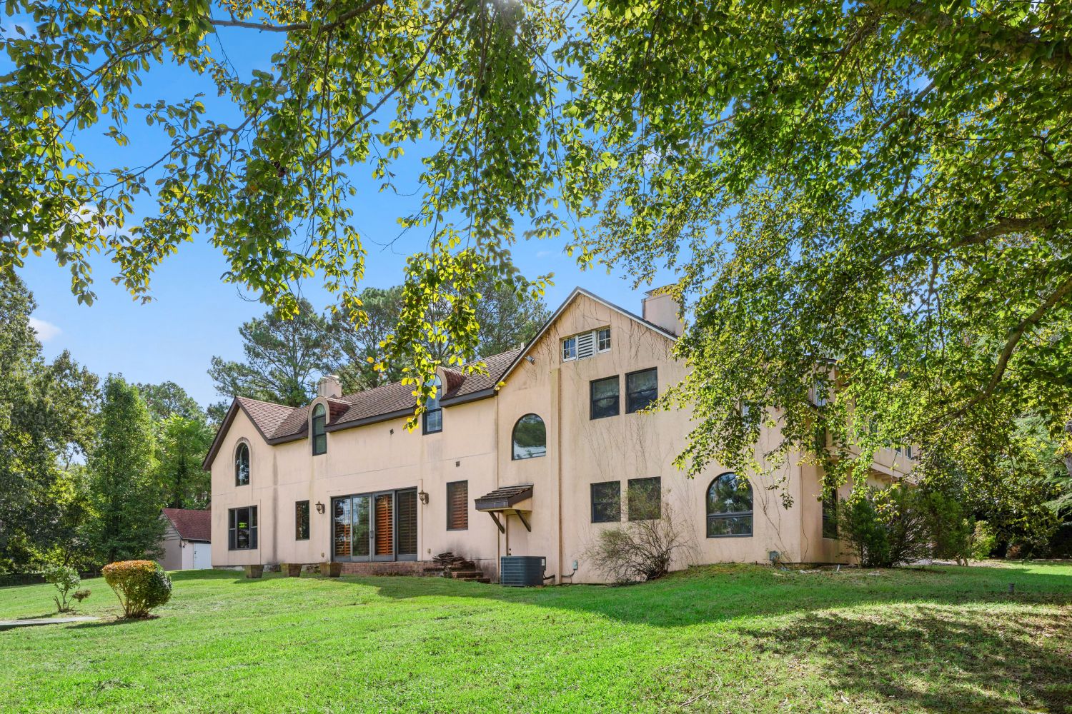 The rear elevation’s asymmetrical massing from the two gables of differing widths and the mix of window sizes and shapes creates a lively façade. The broad expanse of lawn slopes down to Peachblossom Creek.