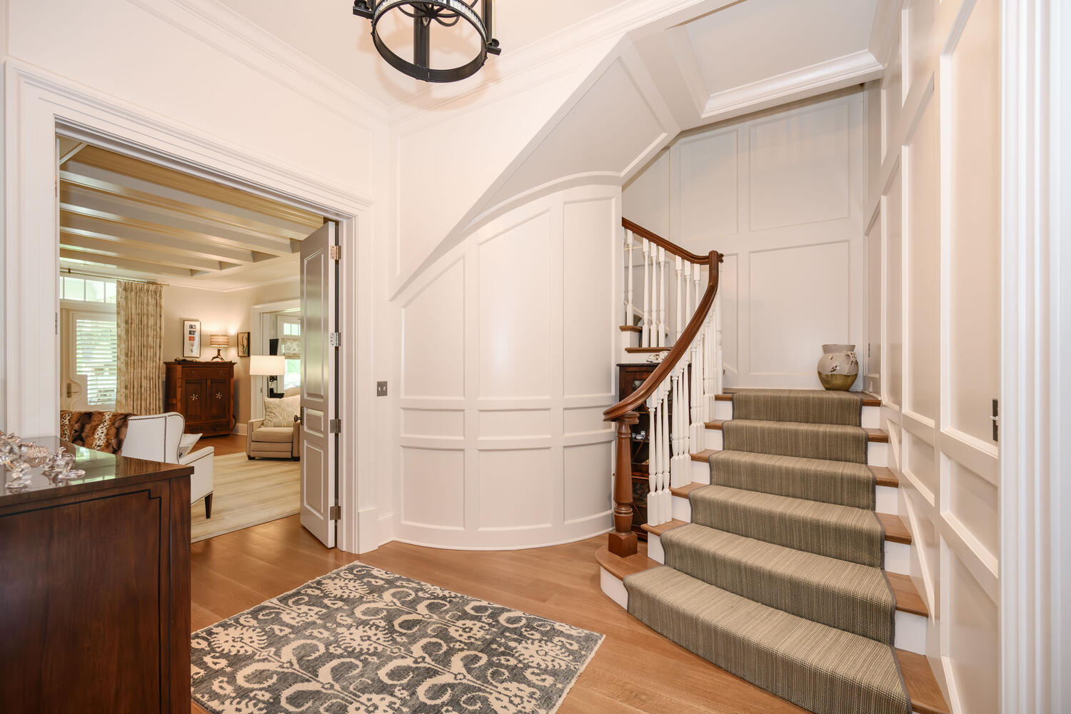 Next to the guest bedroom is the stair to the second floor that is offset from the foyer. The graceful curved wall with its ascending curvature of both wall and ceiling and the widening and curvature of the treads is a great focal point. This space was also carefully thought out in the placement of the trim against the walls for a stunning effect.