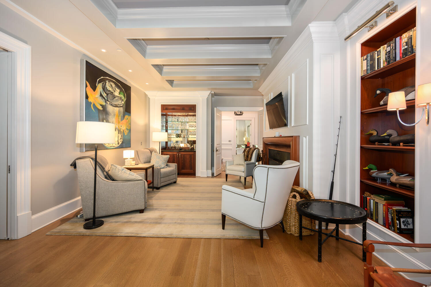 The wide wall opening at the stair with its pair of paneled doors leads to the den/TV room that also connects to the primary bedroom. The ceiling plane was carefully detailed with a row of coffers between soffits on both long walls; one side contains recessed lights; the other side projects slightly over the bespoke millwork and the chimney breast. At the corner is a recessed area under the stair that is a fully equipped bar.