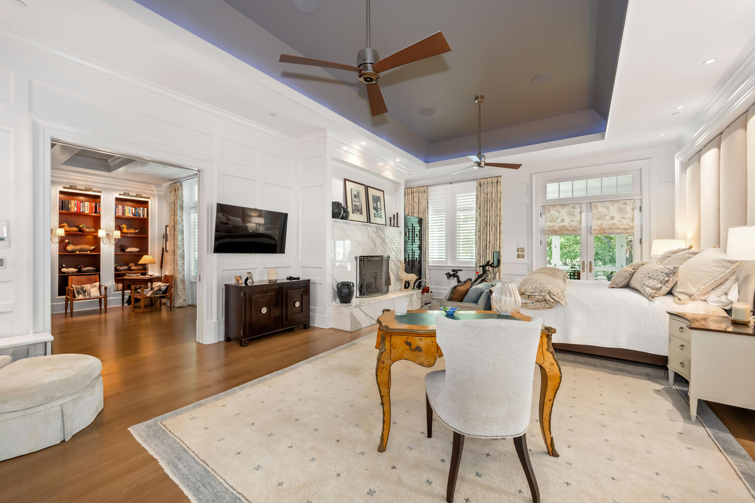 From the den/ TV room, pocket doors lead to the spacious primary bedroom with its dramatic deep blue tray ceiling with hidden lighting. The rear wall’s French doors and a double unit window to the adjacent private screened porch offer indirect views of the landscape and water. The bed is positioned for both the views and it is also across from the TV and fireplace. The soft colors create a serene haven.