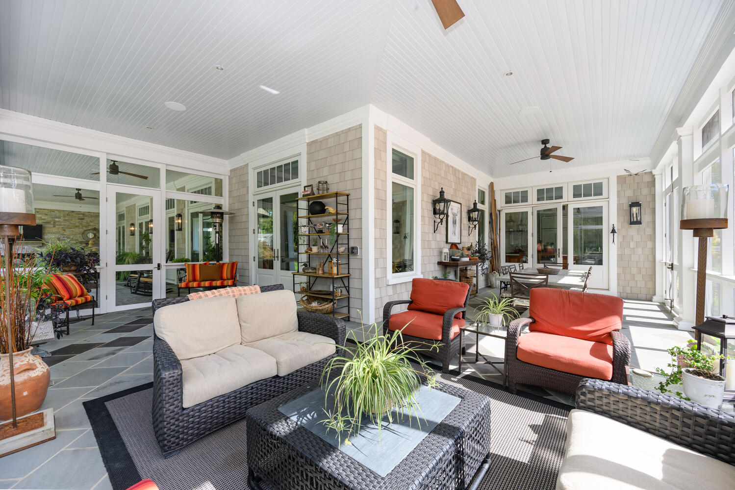 The rear of the house boasts a continuous flow of outdoor spaces, including twin screened porches and water-facing steps.