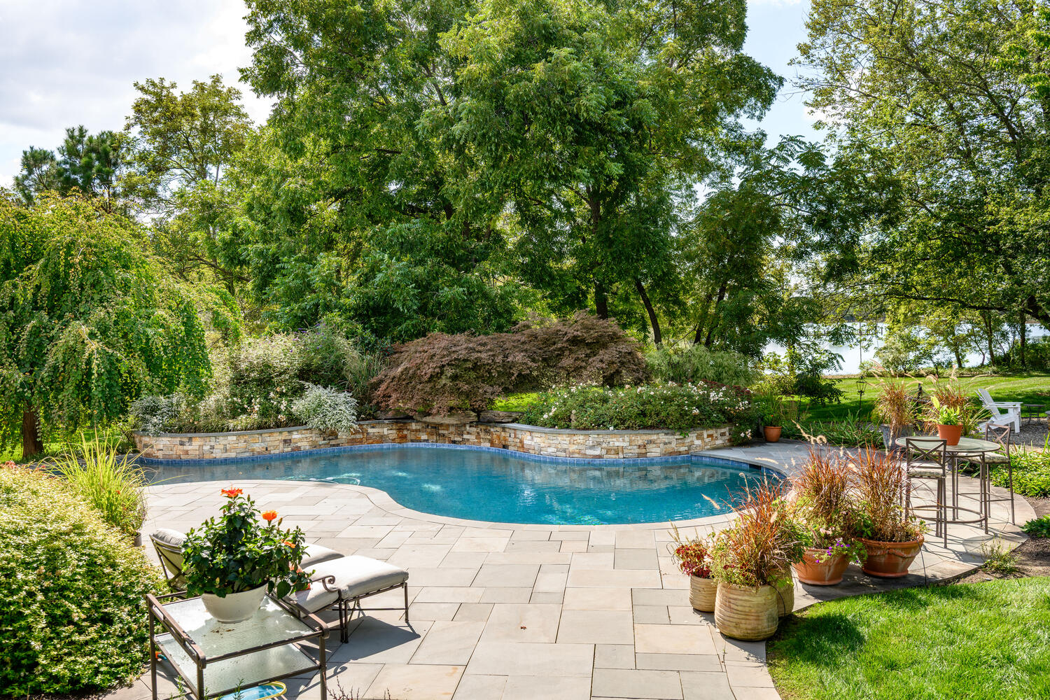 The terrace leads to a twenty foot by forty foot lagoon-style Gunite pool with a waterfall feature, near the outdoor kitchen and a waterside fire pit offering stunning sunset views over the cove. The plantings and mature trees provide privacy.
