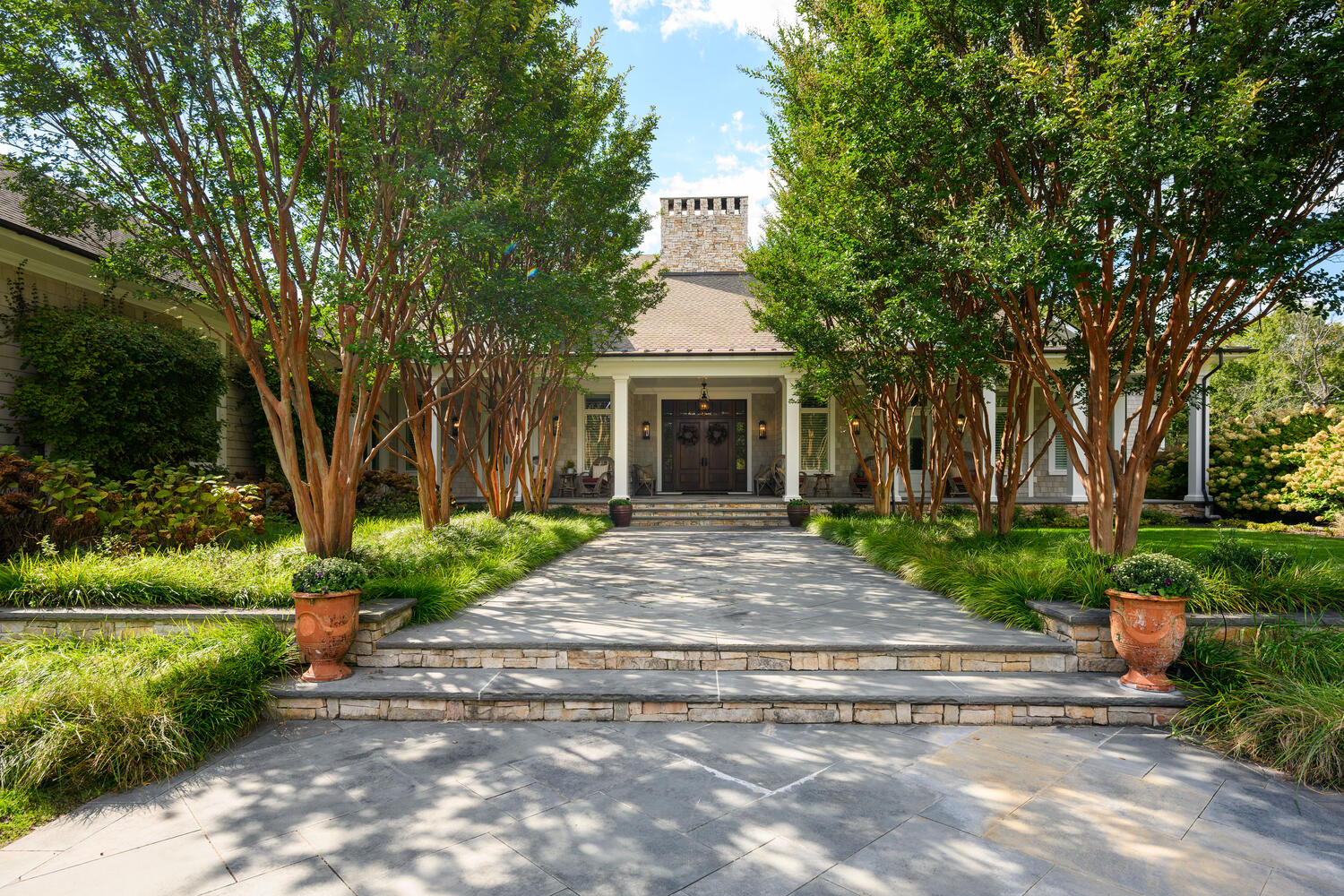 A long, sycamore-lined walkway leads to a deep, stone-clad porch accented by a striking wide chimney design.