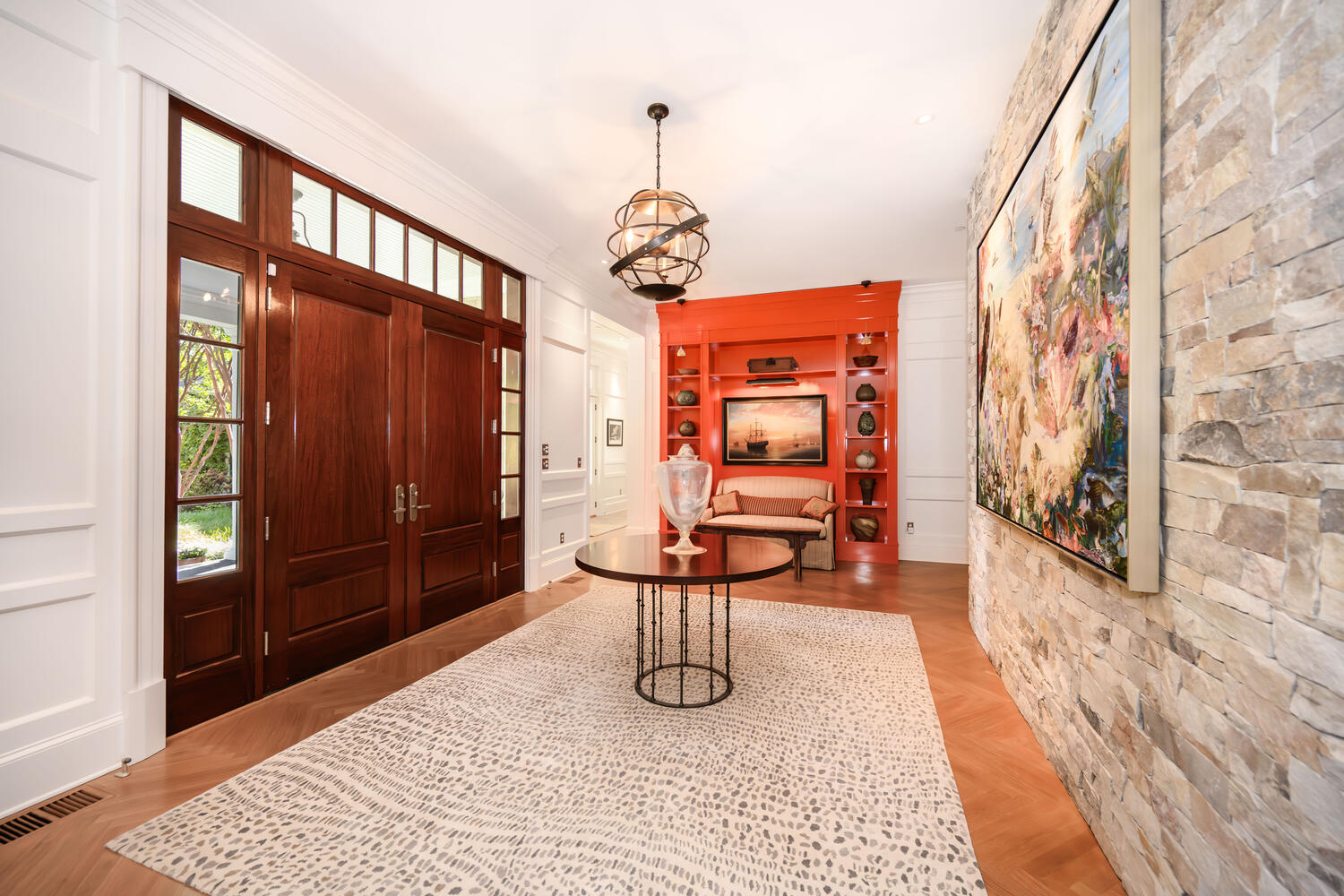 A 12-foot ceiling, bespoke millwork, and stone accents create a grand yet welcoming entry into the home.
