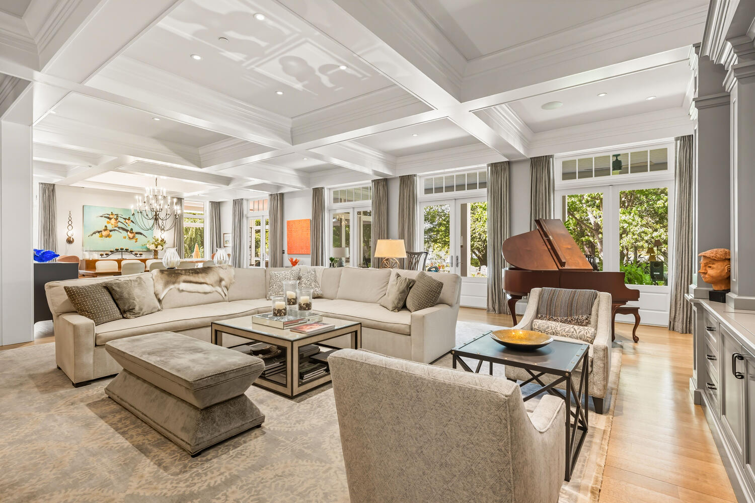 Coffered ceilings and layered seating areas combine elegance with functionality in the open-plan living space.