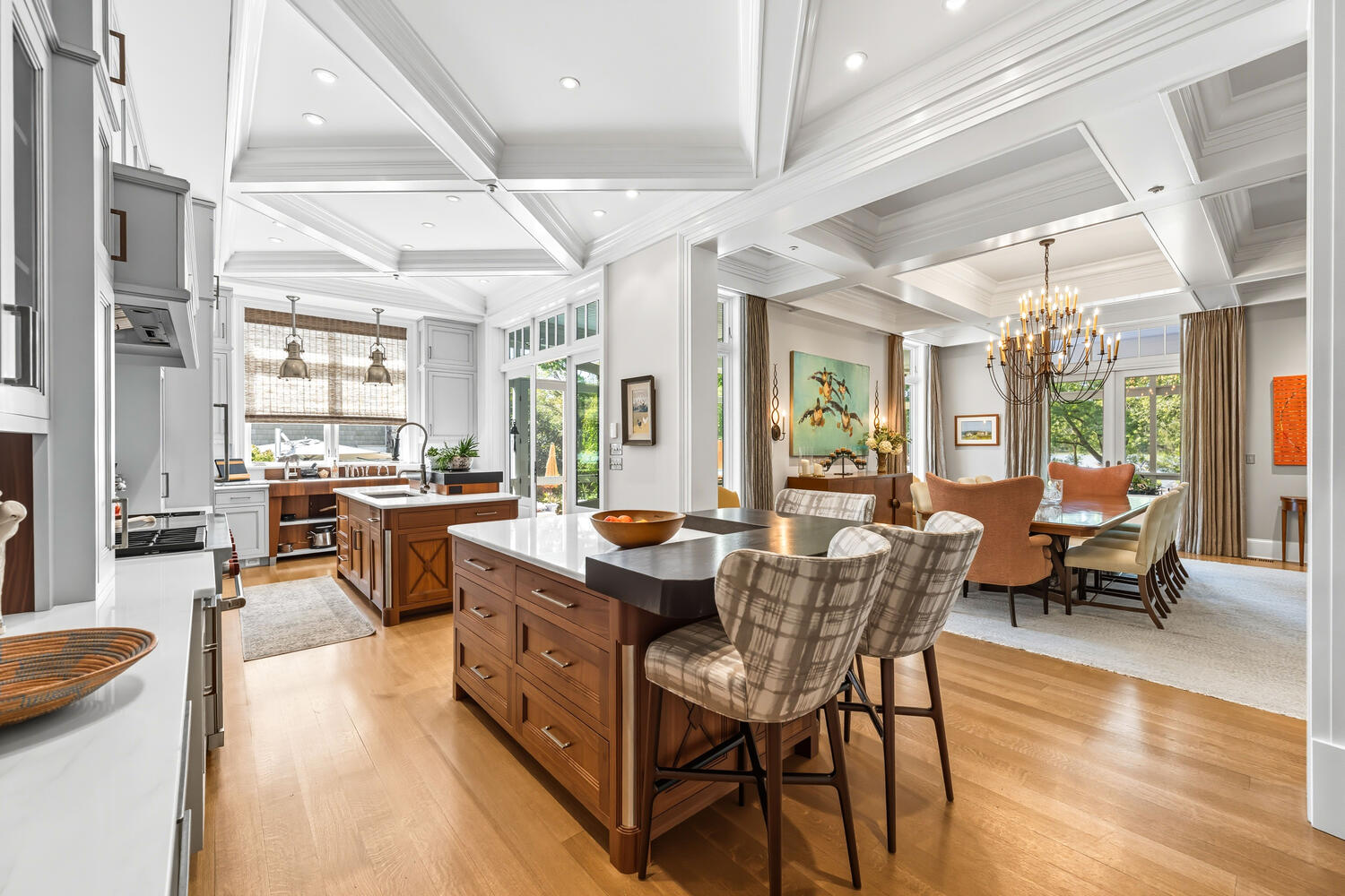 The dining room’s wide wall opening connects the kitchen to the living-dining open plan and provides a view of the water for the kitchen. This stunning kitchen’s interior architecture of the diamond patterned coffered ceiling, wood floors, hand crafted walnut cabinetry with both white and leathered granite countertops and a Wolf six-burner dual oven range is a cook’s dream. The dual islands are practical; one is for food prep and has a view through the adjacent porch to the landscape and water; the other island has bar height chairs for breakfast or homework.