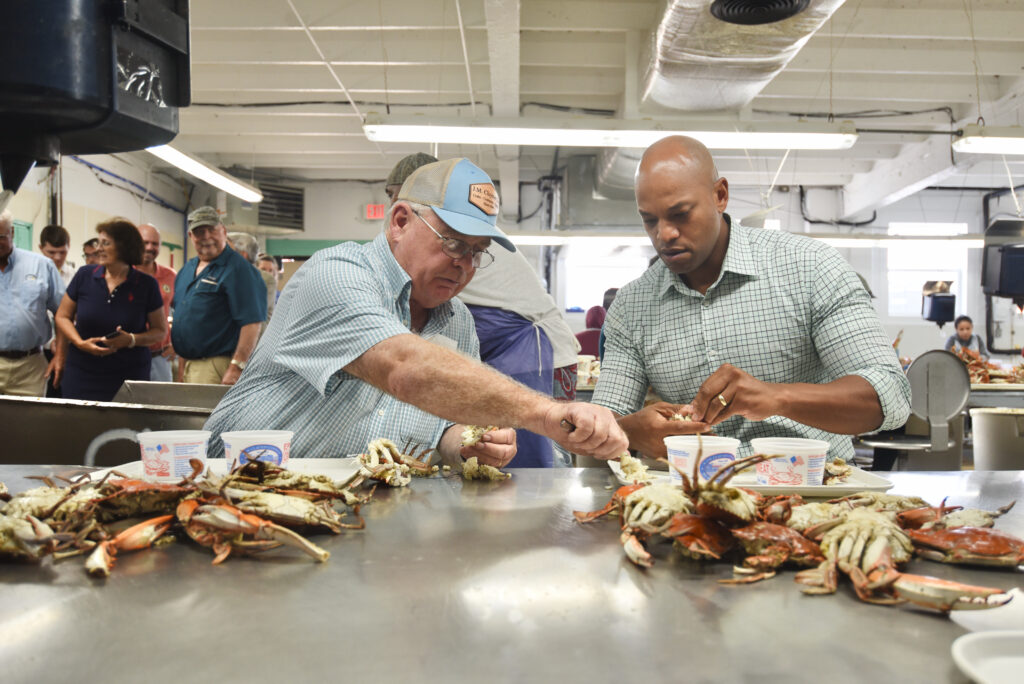 Moore’s visit to the Shore Thursday included stops at J.M. Clayton Seafood Company in Cambridge, where he picked crabs alongside dozens of workers, and at a regenerative crop farm outside Easton.