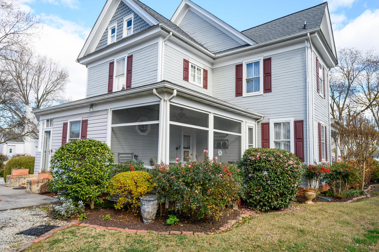 When the current owner bought the house, the exterior color palette was tan siding with green shutters. She chose an exterior color palette of light gray, white trim and deep mulberry shutters was spot on and gives the house a much better curb appeal. The darker gray of the third floor’s scalloped shakes is a great accent of both color and texture. The landscaping along the brick sidewalk is a prelude to the manicured landscaping of the grounds; even in the beginning of winter, there is still color in the plantings.