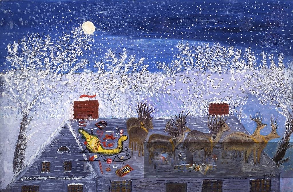 The same sky, stars, and trees are present. Moses features the roof top of the house on which Santa has parked his decorated yellow sleigh filled with packages. Some spill onto the roof. She manages to get all eight reindeer on the roof. Looking closer, the viewer can see a small section of Santa’s red suit sticking out the left chimney.