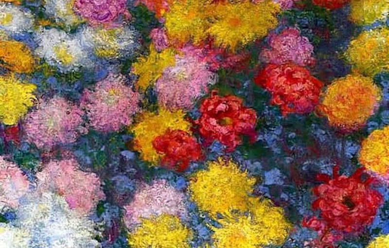 “White and Yellow Chrysanthemums in the Garden at Petit Gennevilliers” (1893) (29’’x34’’) was painted by Gustave Caillebotte. He and Claude Monet, both well-known painters, were great friends, drawn together by art and gardening. Caillebotte made six large, close-up paintings of chrysanthemums in 1893. The Victorians’ obsession with flowers led to the development of the language of flowers. White chrysanthemums, often included in funeral bouquets and wreaths, became associated with mourning. They also are associated with loyalty, honesty, and innocence. Golden yellow mums represent wealth, the sun, happiness, celebration, and longevity. Pink mums represent attraction and romance–red mums, love and passion. Violet mums were given to the ill, as a wish for return to health. Caillebotte delineates the individual petals, uses bright colors, and portrays sunlight light dancing across the canvas.