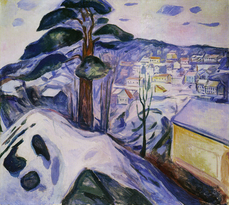 Munch moved to Kragero in 1908 after his nervous breakdown. He found the light and environment stimulating. He began painting urban scenes in 1909. “Winter in Kragero” (1925-31) (54”x59”) is a depiction of the city from a distance. The large yellow building at the right of the canvas is set next to the snow-covered roof of a house, neither painted in detail. A tall tree and a very slim tree stand on the diagonal slope that leads to the city. Kragero’s buildings rise up the hillside, and behind them are mountains. Although he frequently included scenes of towns in his work, these later paintings place the town at a distance.