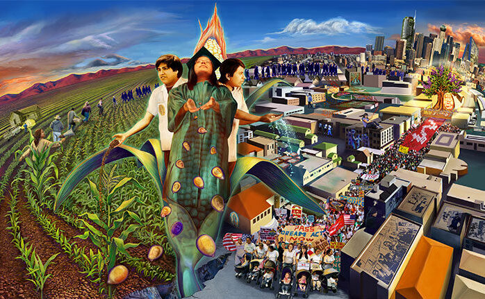 Alvarado stands at the center of the large ear of corn. To her left, representing agriculture, is a field where corn is being harvested. To her right is an expansive view of Los Angeles where she can now take her place, but not without continued struggle. In the foreground, women march peacefully in support of the passage of the Dream Act, legislation to create a pathway to citizenship for undocumented immigrants who came to American as children.