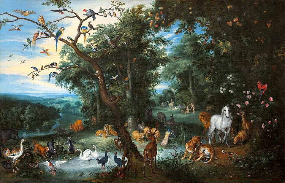 “The Garden of Eden” (1655-61) (23’’x35’’), by Flemish painter Isaak van Oosten (1631-1661), is a depiction of a large and glorious Paradise. Animals of all kinds are in pairs, and the birds are painted in great numbers. The trees are in full bloom. Plants, fruit, and flowers are abundant. Van Oosten preferred painting landscapes and animals, and created several of Eden. Although he was a Protestant, his paintings associate the Torah’s theological emphasis on Eden as the Promised Land for God’s people.