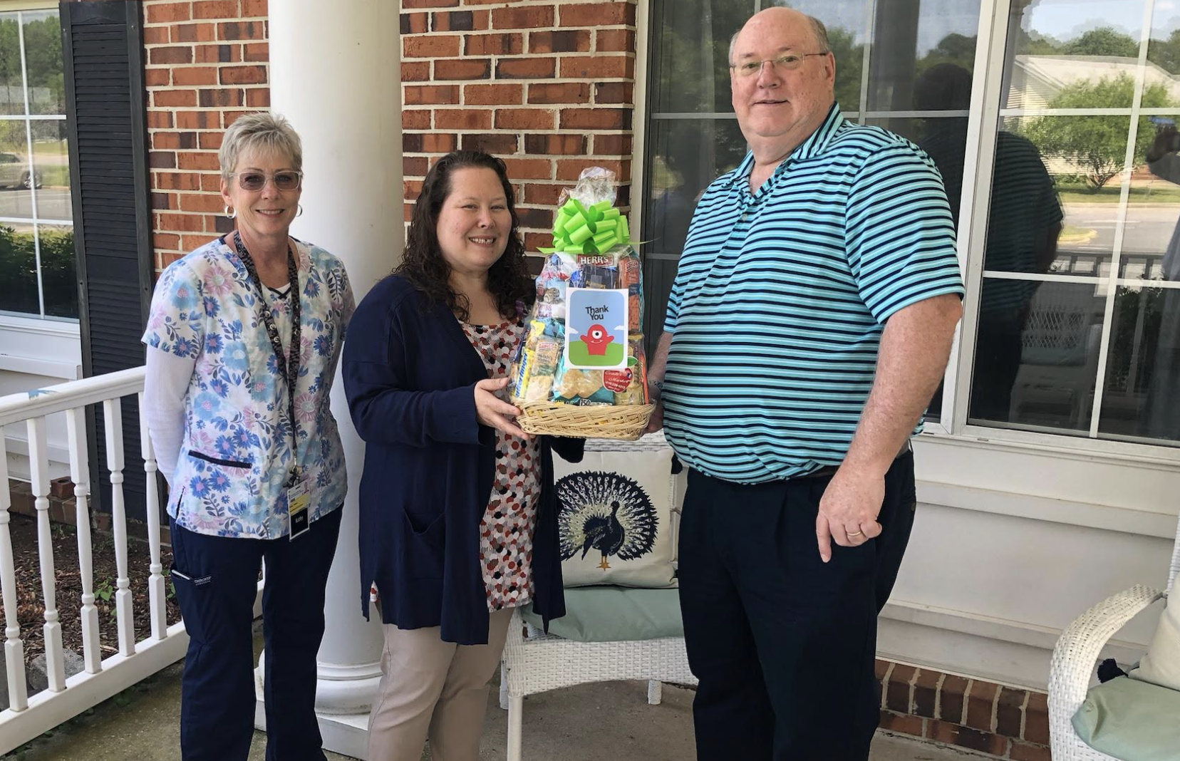 Population Health team members Kathy Sellers (left) and Terry Satchell (right) delivered a gift basket to Angela Shenton, Manager of Homestead Manor Assisted Living in Denton, Md. Homestead Manor is one of several residential care communities that participated in Population Health’s Advance Directives Campaign.