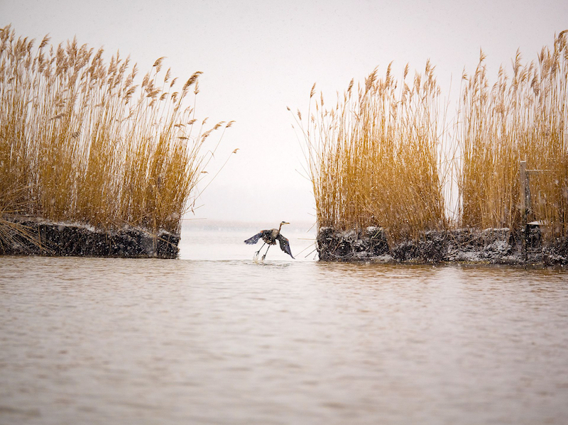 He explains that he often finds inspiration for his photographs in the marshy areas in and around the Bay, where the land and the water meet. This is where the above-water life he is looking for is so apparent, he says. He also seeks the edges of the days to work, from first light to sunrise and from late afternoon into dusk, when he finds his subjects “bathed in warm light and with long, revealing shadows.”